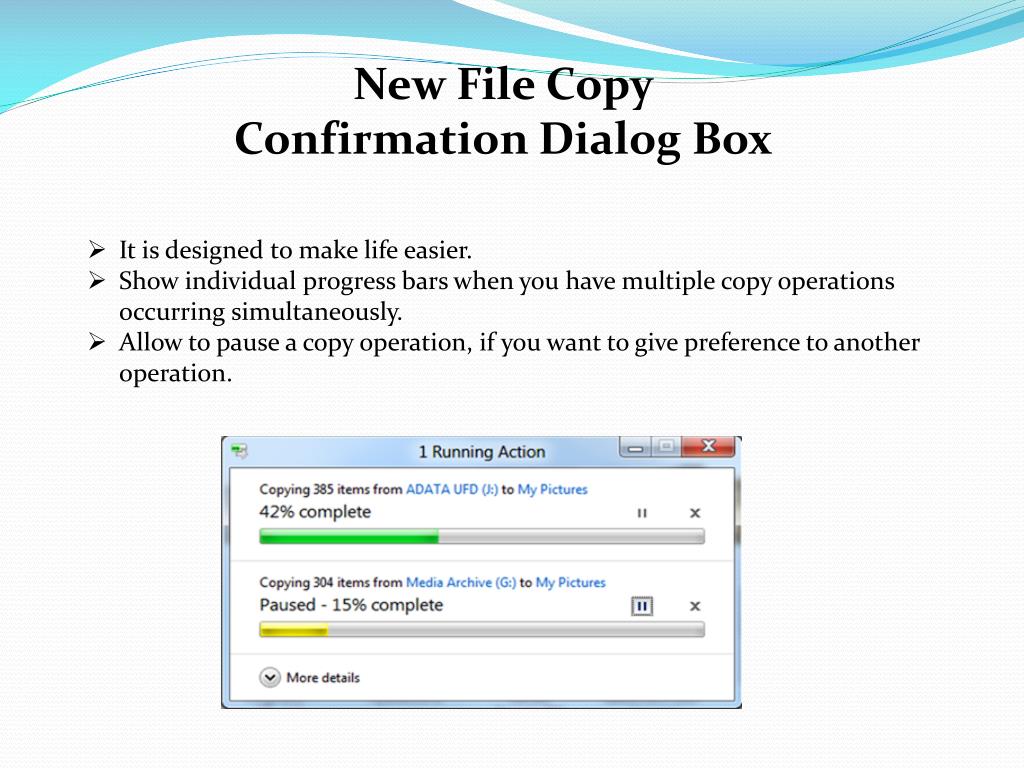 New File Copy Confirmation Dialog Box • It is designed to make life easier. • Show individual progress bars when you have multiple copy operations occurring simultaneously. • Allow to pause a copy operation, if you want to give preference to another operation.