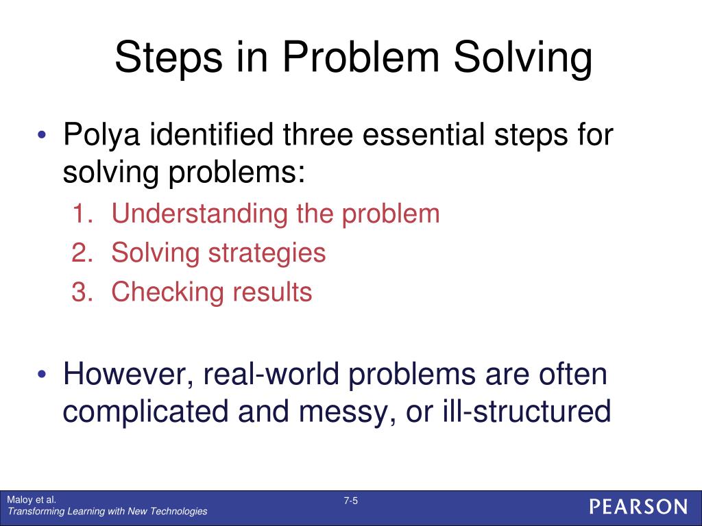 Steps in Problem Solving • Polya identified three essential steps for solving problems: • Understanding the problem • Solving strategies • Checking results • However, real-world problems are often complicated and messy, or ill-structured