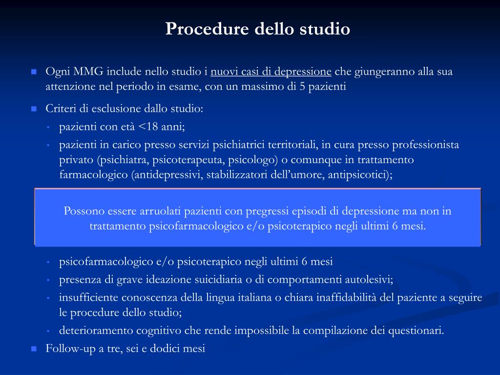 Procedure dello studio Ogni MMG include nello studio i nuovi casi di depressione che giungeranno alla sua attenzione nel periodo in esame, con un massimo di 5 pazienti Criteri di esclusione dallo studio: pazienti con età <18 anni; pazienti in carico presso servizi psichiatrici territoriali, in cura presso professionista privato (psichiatra, psicoterapeuta, psicologo) o comunque in trattamento farmacologico (antidepressivi, stabilizzatori dell’umore, antipsicotici); psicofarmacologico e/o psicoterapico negli ultimi 6 mesi presenza di grave ideazione suicidiaria o di comportamenti autolesivi; insufficiente conoscenza della lingua italiana o chiara inaffidabilità del paziente a seguire le procedure dello studio; deterioramento cognitivo che rende impossibile la compilazione dei questionari. Follow-up a tre, sei e dodici mesi Possono essere arruolati pazienti con pregressi episodi di depressione ma non in trattamento psicofarmacologico e/o psicoterapico negli ultimi 6 mesi.