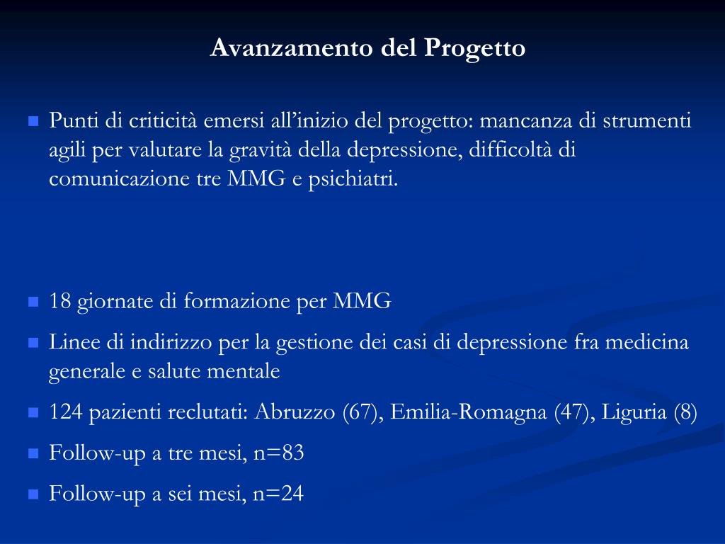 Avanzamento del Progetto Punti di criticità emersi all’inizio del progetto: mancanza di strumenti agili per valutare la gravità della depressione, difficoltà di comunicazione tre MMG e psichiatri. 18 giornate di formazione per MMG Linee di indirizzo per la gestione dei casi di depressione fra medicina generale e salute mentale 124 pazienti reclutati: Abruzzo (67), Emilia-Romagna (47), Liguria (8) Follow-up a tre mesi, n=83 Follow-up a sei mesi, n=24
