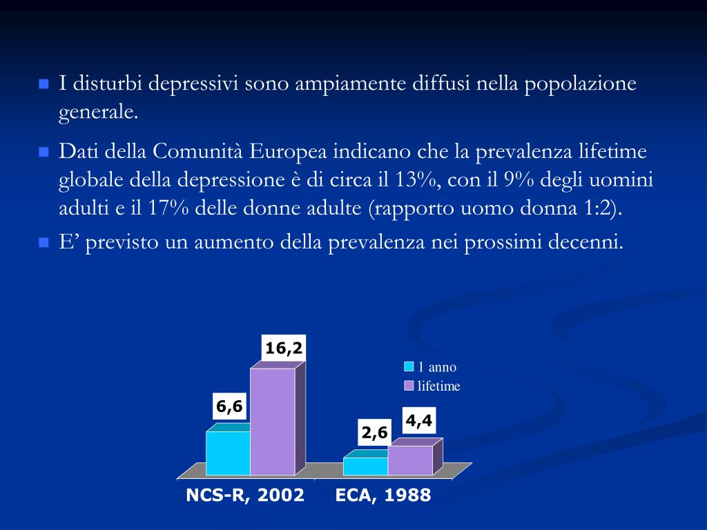 I disturbi depressivi sono ampiamente diffusi nella popolazione generale. Dati della Comunità Europea indicano che la prevalenza lifetime globale della depressione è di circa il 13%, con il 9% degli uomini adulti e il 17% delle donne adulte (rapporto uomo donna 1:2). E’ previsto un aumento della prevalenza nei prossimi decenni.