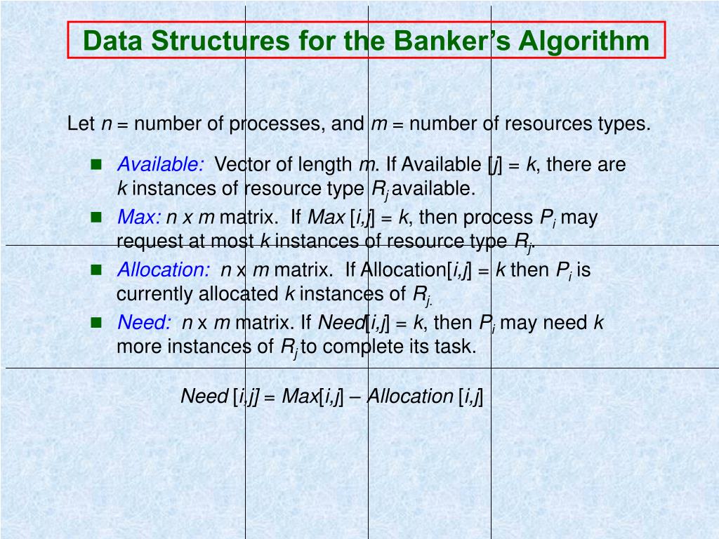 Data Structures for the Banker’s Algorithm Let n = number of processes, and m = number of resources types. • Available: Vector of length m. If Available [j] = k, there are k instances of resource type Rjavailable. • Max: n x m matrix. If Max [i,j] = k, then process Pimay request at most k instances of resource type Rj. • Allocation: n x m matrix. If Allocation[i,j] = k then Pi is currently allocated k instances of Rj. • Need: n x m matrix. If Need[i,j] = k, then Pi may need k more instances of Rjto complete its task. Need [i,j] = Max[i,j] – Allocation [i,j]