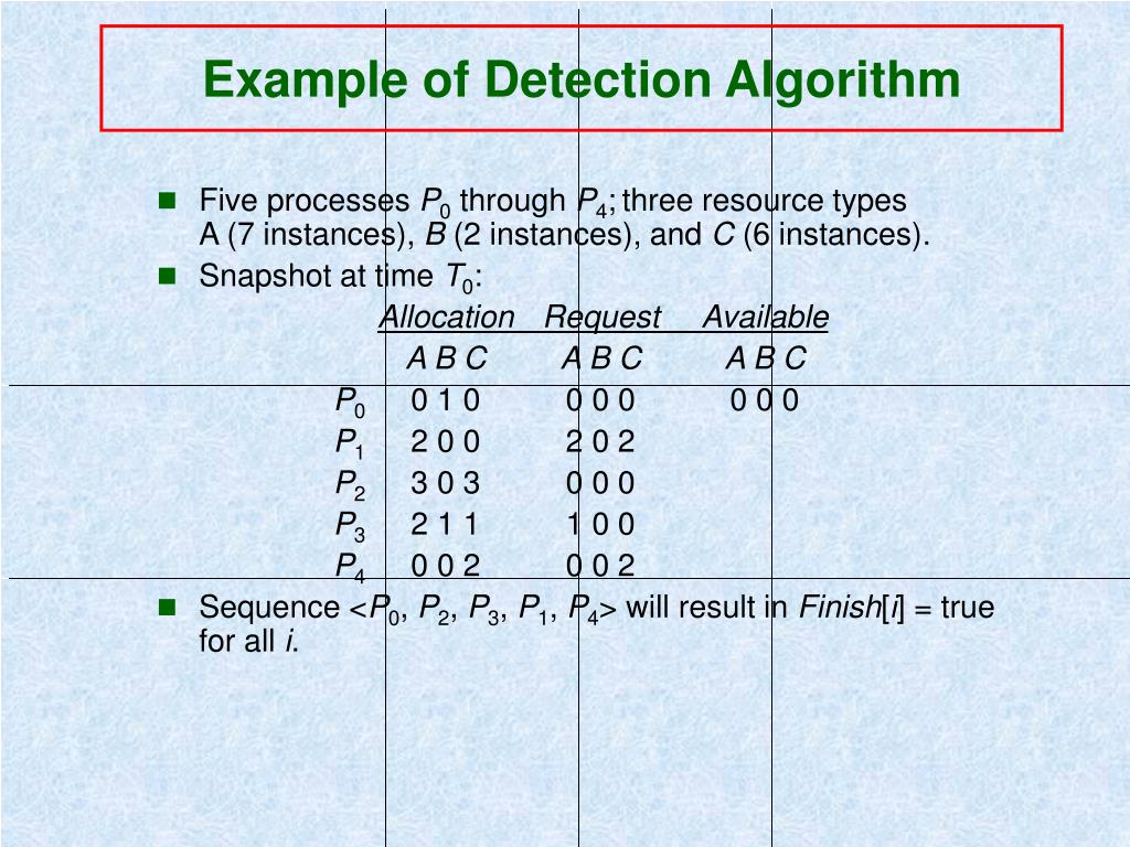 Detection Algorithm 1. Let Work and Finish be vectors of length m and n,respectively. Initialize: (a) Work = Available (b) For i = 1,2, …, n, if Allocationi 0, then Finish[i] = false;otherwise, Finish[i] = true. 2. Find an index i such that both: (a) Finish[i] == false (b) Requesti Work If no such i exists, go to step 4.