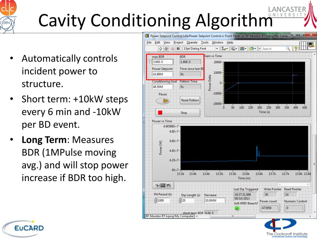 Cavity Conditioning Algorithm Automatically controls incident power to structure. Short term: +10kW steps every 6 min and -10kW per BD event. Long Term: Measures BDR (1MPulse moving avg.) and will stop power increase if BDR too high.