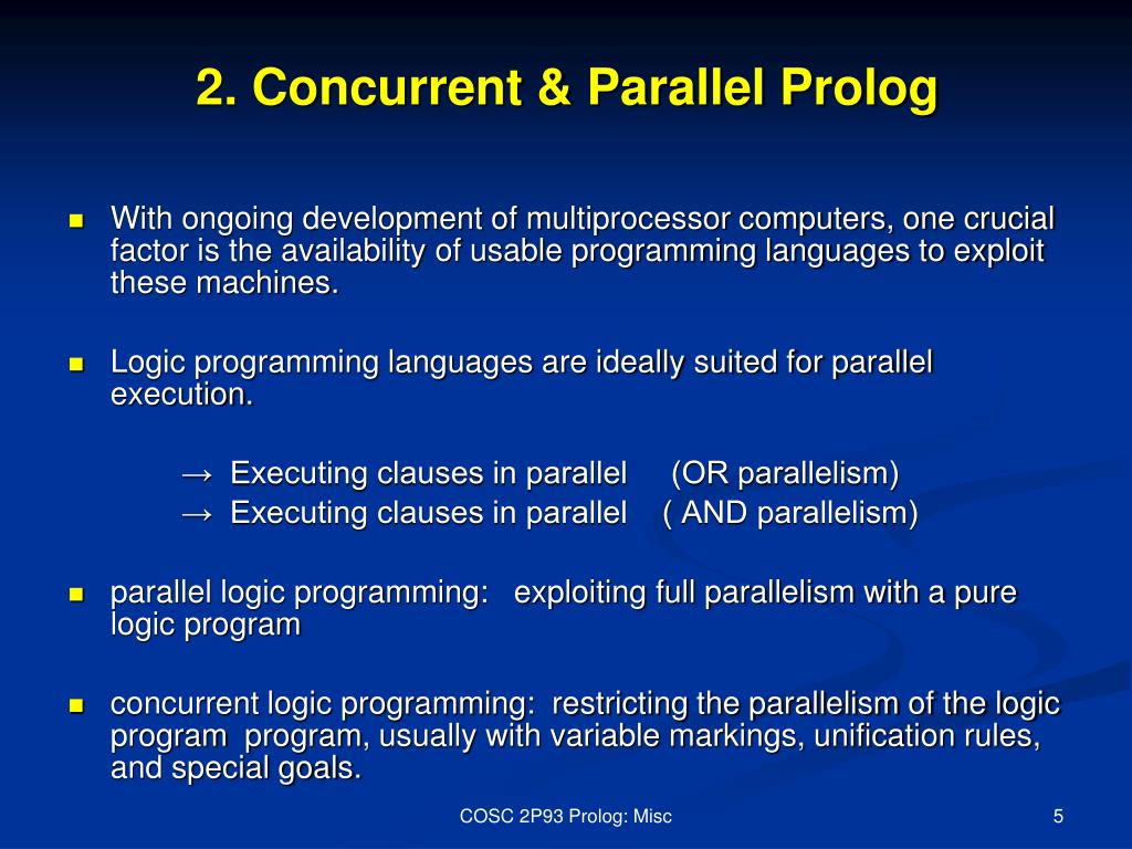2. Concurrent & Parallel Prolog COSC 2P93 Prolog: Misc With ongoing development of multiprocessor computers, one crucial factor is the availability of usable programming languages to exploit these machines. Logic programming languages are ideally suited for parallel execution. → Executing clauses in parallel (OR parallelism) → Executing clauses in parallel ( AND parallelism) parallel logic programming: exploiting full parallelism with a pure logic program concurrent logic programming: restricting the parallelism of the logic program program, usually with variable markings, unification rules, and special goals.