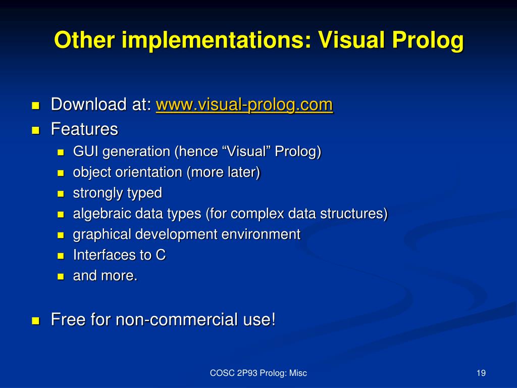 Other implementations: Visual Prolog COSC 2P93 Prolog: Misc • Download at: www.visual-prolog.com • Features • GUI generation (hence “Visual” Prolog) • object orientation (more later) • strongly typed • algebraic data types (for complex data structures) • graphical development environment • Interfaces to C • and more. • Free for non-commercial use!