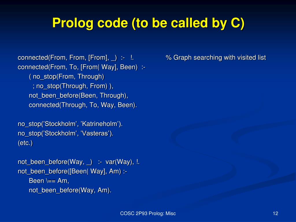 Prolog code (to be called by C) COSC 2P93 Prolog: Misc connected(From, From, [From], _) :- !. % Graph searching with visited list connected(From, To, [From| Way], Been) :- ( no_stop(From, Through) ; no_stop(Through, From) ), not_been_before(Been, Through), connected(Through, To, Way, Been). no_stop(’Stockholm’, ’Katrineholm’). no_stop(’Stockholm’, ’Vasteras’). (etc.) not_been_before(Way, _) :- var(Way), !. not_been_before([Been| Way], Am) :- Been \== Am, not_been_before(Way, Am).