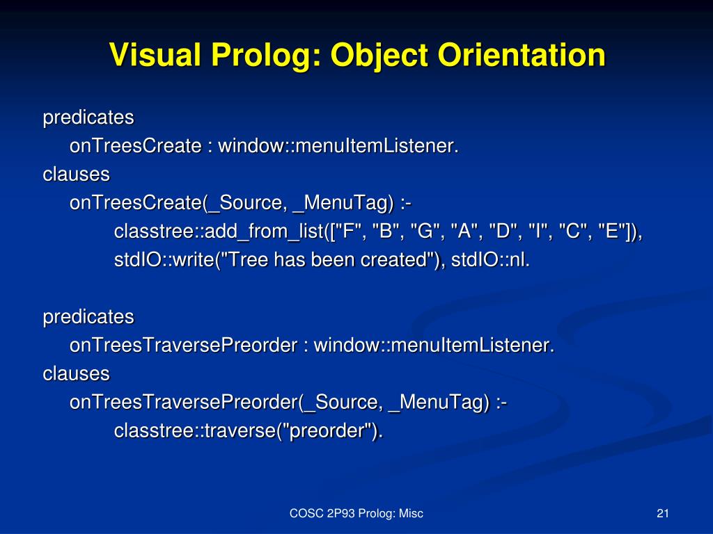 Visual Prolog: Object Orientation COSC 2P93 Prolog: Misc predicates onTreesCreate : window::menuItemListener. clauses onTreesCreate(_Source, _MenuTag) :- classtree::add_from_list(["F", "B", "G", "A", "D", "I", "C", "E"]), stdIO::write("Tree has been created"), stdIO::nl. predicates onTreesTraversePreorder : window::menuItemListener. clauses onTreesTraversePreorder(_Source, _MenuTag) :- classtree::traverse("preorder").
