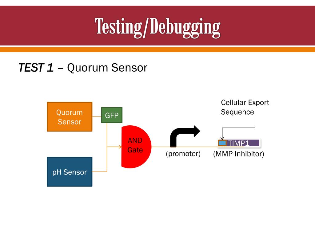Testing/Debugging TEST 1 – Quorum Sensor Cellular Export Sequence Quorum Sensor GFP AND Gate TIMP1 (promoter) (MMP Inhibitor) pH Sensor