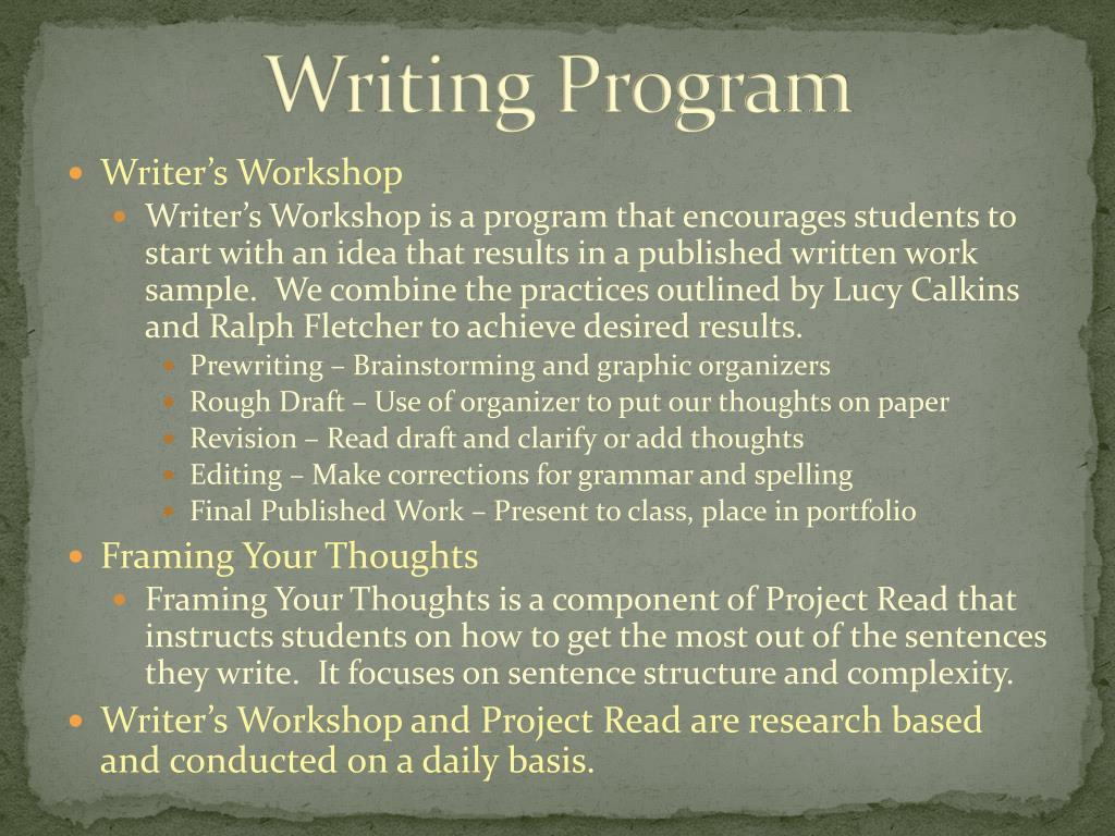 Writing Program • Writer’s Workshop • Writer’s Workshop is a program that encourages students to start with an idea that results in a published written work sample. We combine the practices outlined by Lucy Calkins and Ralph Fletcher to achieve desired results. • Prewriting – Brainstorming and graphic organizers • Rough Draft – Use of organizer to put our thoughts on paper • Revision – Read draft and clarify or add thoughts • Editing – Make corrections for grammar and spelling • Final Published Work – Present to class, place in portfolio • Framing Your Thoughts • Framing Your Thoughts is a component of Project Read that instructs students on how to get the most out of the sentences they write. It focuses on sentence structure and complexity. • Writer’s Workshop and Project Read are research based and conducted on a daily basis.