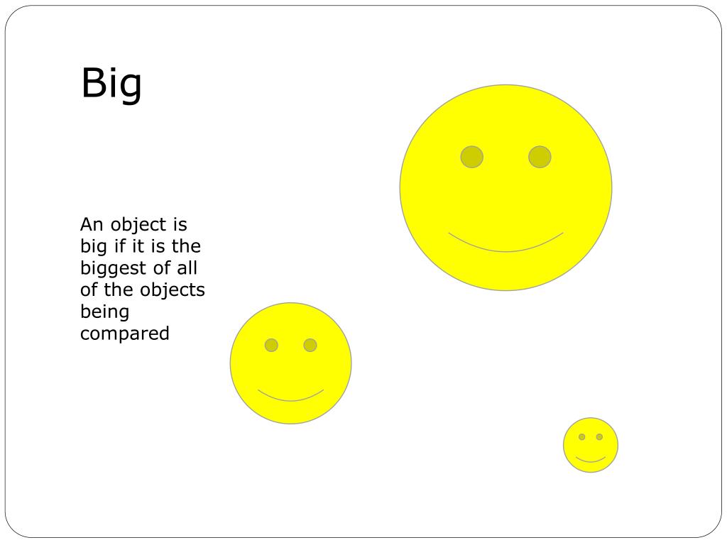 Small, Medium, and Big • By saying that something is small, medium, or large you are sorting it based on its size. • Objects come in all sizes but they all can be sorted into one group. That being a small group, medium group, or large group.
