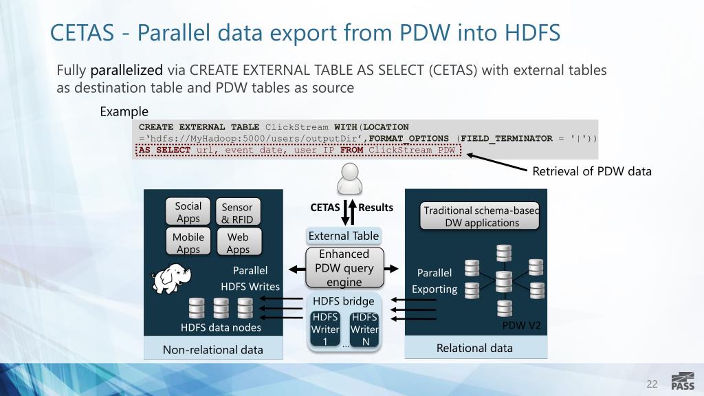 CETAS - Parallel data export from PDW into HDFS • Fully parallelized via CREATE EXTERNAL TABLE AS SELECT (CETAS) with external tables as destination table and PDW tables as source Example CREATE EXTERNAL TABLE ClickStreamWITH(LOCATION =‘hdfs://MyHadoop:5000/users/outputDir’,FORMAT_OPTIONS (FIELD_TERMINATOR = '|')) ASSELECT url, event_date, user_IPFROMClickStream_PDW Retrieval of PDW data CETAS Results Traditional schema-based DW applications External Table Enhanced PDW query engine Social Apps WebApps Sensor & RFID Mobile Apps Parallel HDFS Writes ParallelExporting HDFS bridge HDFS Writer 1 HDFS WriterN PDW V2 … HDFS data nodes Relational data Non-relational data