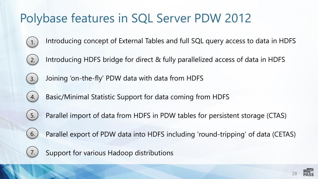Polybase features in SQL Server PDW 2012 • Introducing concept of External Tables and full SQL query access to data in HDFS • Introducing HDFS bridge for direct & fully parallelized access of data in HDFS • Joining ‘on-the-fly’ PDW data with data from HDFS • Basic/Minimal Statistic Support for data coming from HDFS • Parallel import of data from HDFS in PDW tables for persistent storage (CTAS) • Parallel export of PDW data into HDFS including ‘round-tripping’ of data (CETAS) • Support for various Hadoop distributions 1. 2. 3. 4. 5. 6. 7.