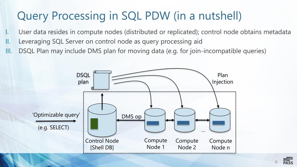 Query Processing in SQL PDW (in a nutshell) • User data resides in compute nodes (distributed or replicated); control node obtains metadata • Leveraging SQL Server on control node as query processing aid • DSQL Plan may include DMS plan for moving data (e.g. for join-incompatible queries) Plan Injection DSQL plan ‘Optimizable query’ DMS op (e.g. SELECT) … ComputeNode 1 ComputeNode 2 Control Node [Shell DB] ComputeNode n