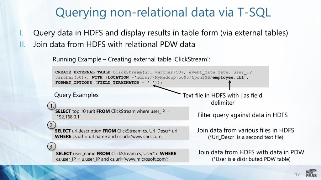 Querying non-relational data via T-SQL • Query data in HDFS and display results in table form (via external tables) • Join data from HDFS with relational PDW data Running Example – Creating external table ‘ClickStream’: CREATE EXTERNAL TABLE ClickStream(urlvarchar(50), event_date date, user_IPvarchar(50)), WITH (LOCATION =‘hdfs://MyHadoop:5000/tpch1GB/employee.tbl’, FORMAT_OPTIONS (FIELD_TERMINATOR = '|')); Query Examples Text file in HDFS with | as field delimiter SELECT top 10 (url) FROMClickStream where user_IP = ‘192.168.0.1’ Filter query against data in HDFS 2. 1. 3. Join data from various files in HDFS (*Url_Descr is a second text file) SELECTurl.descriptionFROM ClickStreamcs, Url_Descr* urlWHERE cs.url = url.name and cs.url=’www.cars.com’; Join data from HDFS with data in PDW(*User is a distributed PDW table) SELECTuser_nameFROMClickStreamcs, User* u WHEREcs.user_IP = u.user_IP and cs.url=’www.microsoft.com’;