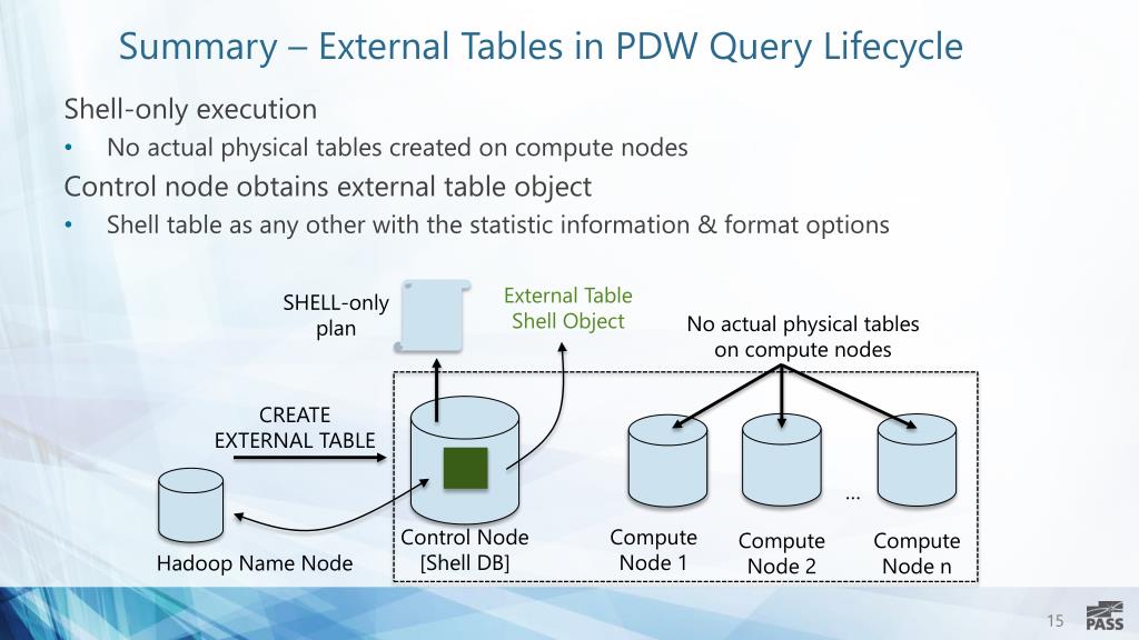 Summary – External Tables in PDW Query Lifecycle • Shell-only execution • No actual physical tables created on compute nodes • Control node obtains external table object • Shell table as any other with the statistic information & format options CREATE EXTERNAL TABLE External Table Shell Object SHELL-only plan No actual physical tables on compute nodes … Control Node [Shell DB] ComputeNode 1 ComputeNode 2 ComputeNode n Hadoop Name Node