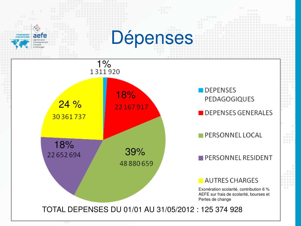 Dépenses 1% 18% 24 % 18% 39% Exonération scolarité, contribution 6 % AEFE sur frais de scolarité, bourses et Pertes de change TOTAL DEPENSES DU 01/01 AU 31/05/2012 : 125 374 928