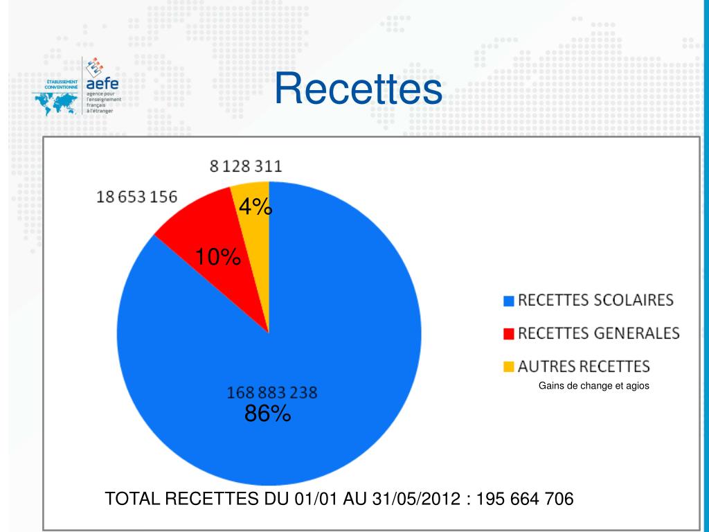 Recettes 4% 10% Gains de change et agios 86% TOTAL DES RECETTES DU 01/01 AU 31/05/2012 : 196 924 706 TOTAL RECETTES DU 01/01 AU 31/05/2012 : 195 664 706