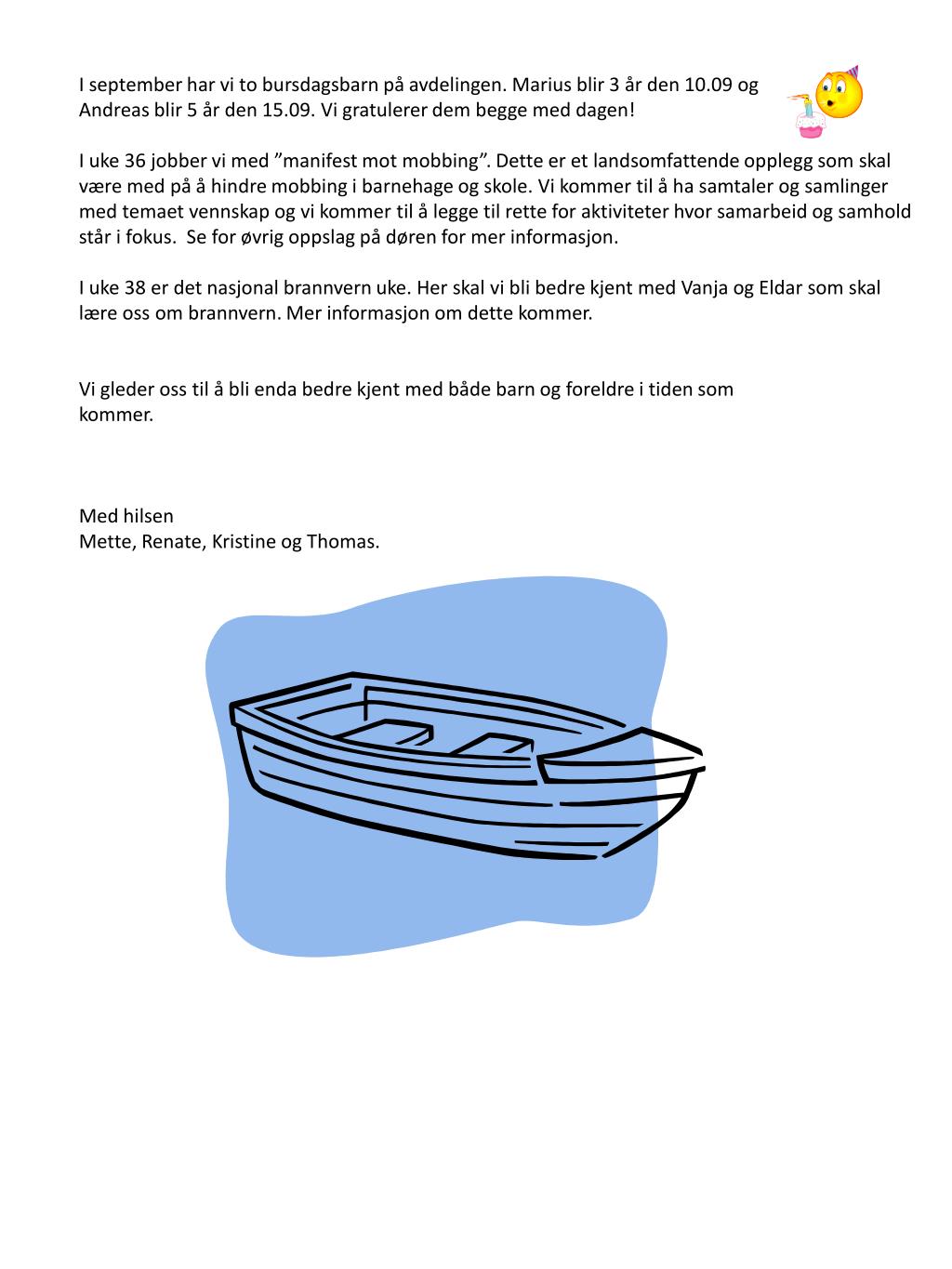 I september har vi to bursdagsbarn på avdelingen. Marius blir 3 år den 10.09 og Andreas blir 5 år den 15.09. Vi gratulerer dem begge med dagen! I uke 36 jobber vi med ”manifest mot mobbing”. Dette er et landsomfattende opplegg som skal være med på å hindre mobbing i barnehage og skole. Vi kommer til å ha samtaler og samlinger med temaet vennskap og vi kommer til å legge til rette for aktiviteter hvor samarbeid og samhold står i fokus. Se for øvrig oppslag på døren for mer informasjon. I uke 38 er det nasjonal brannvern uke. Her skal vi bli bedre kjent med Vanja og Eldar som skal lære oss om brannvern. Mer informasjon om dette kommer. Vi gleder oss til å bli enda bedre kjent med både barn og foreldre i tiden som kommer. Med hilsen Mette, Renate, Kristine og Thomas.