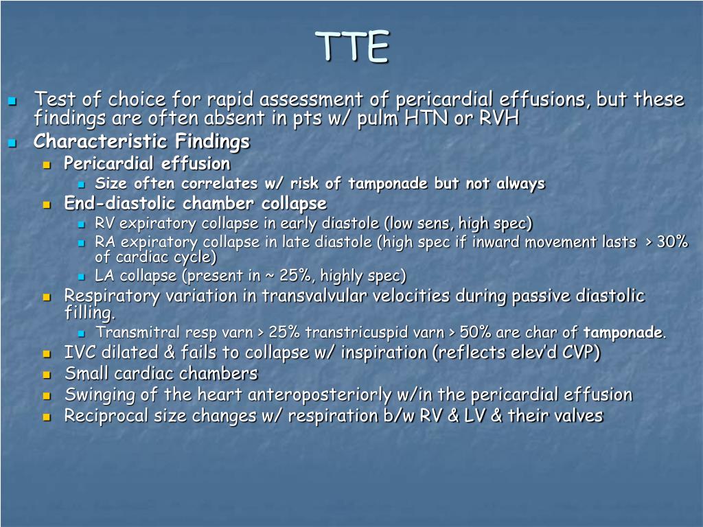 TTE • Test of choice for rapid assessment of pericardial effusions, but these findings are often absent in pts w/ pulm HTN or RVH • Characteristic Findings • Pericardial effusion • Size often correlates w/ risk of tamponade but not always • End-diastolic chamber collapse • RV expiratory collapse in early diastole (low sens, high spec) • RA expiratory collapse in late diastole (high spec if inward movement lasts > 30% of cardiac cycle) • LA collapse (present in ~ 25%, highly spec) • Respiratory variation in transvalvular velocities during passive diastolic filling. • Transmitral resp varn > 25% transtricuspid varn > 50% are char of tamponade. • IVC dilated & fails to collapse w/ inspiration (reflects elev’d CVP) • Small cardiac chambers • Swinging of the heart anteroposteriorly w/in the pericardial effusion • Reciprocal size changes w/ respiration b/w RV & LV & their valves