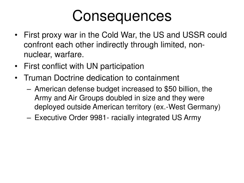 Consequences • First proxy war in the Cold War, the US and USSR could confront each other indirectly through limited, non-nuclear, warfare. • First conflict with UN participation • Truman Doctrine dedication to containment • American defense budget increased to $50 billion, the Army and Air Groups doubled in size and they were deployed outside American territory (ex.-West Germany) • Executive Order 9981- racially integrated US Army