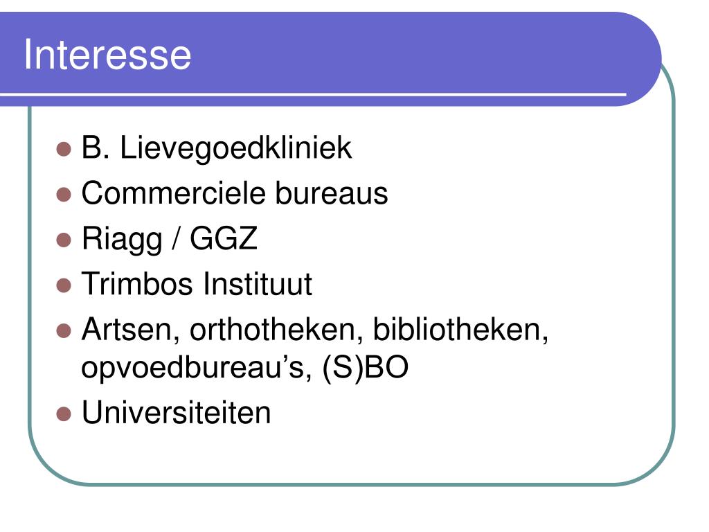 Interesse • B. Lievegoedkliniek • Commerciele bureaus • Riagg / GGZ • Trimbos Instituut • Artsen, orthotheken, bibliotheken, opvoedbureau’s, (S)BO • Universiteiten