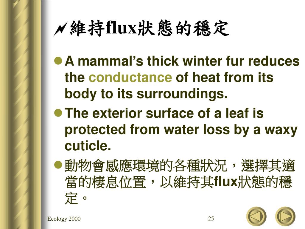 維持flux狀態的穩定 • A mammal’s thick winter fur reduces the conductance of heat from its body to its surroundings. • The exterior surface of a leaf is protected from water loss by a waxy cuticle. • 動物會感應環境的各種狀況,選擇其適當的棲息位置,以維持其flux狀態的穩定。