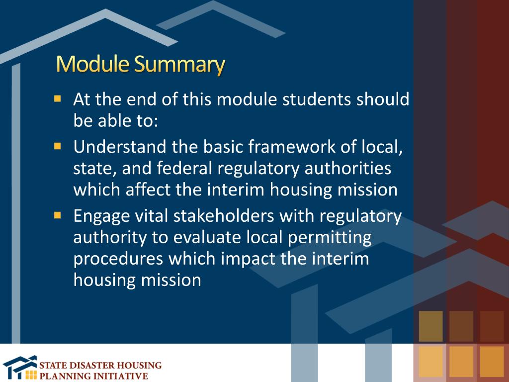 Module Summary • At the end of this module students should be able to: • Understand the basic framework of local, state, and federal regulatory authorities which affect the interim housing mission • Engage vital stakeholders with regulatory authority to evaluate local permitting procedures which impact the interim housing mission
