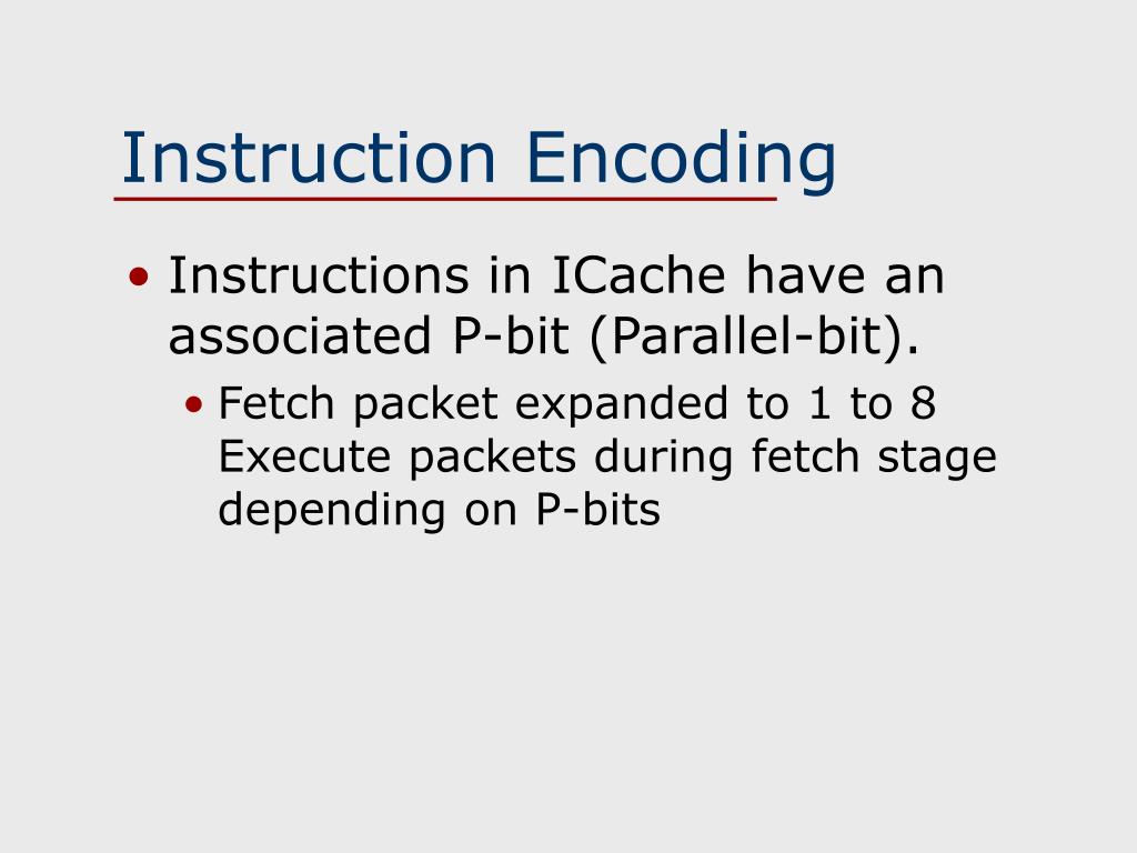 Instruction Encoding • Instructions in ICache have an associated P-bit (Parallel-bit). • Fetch packet expanded to 1 to 8 Execute packets during fetch stage depending on P-bits