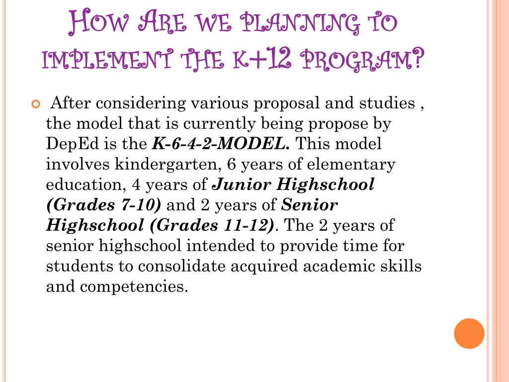 How Are we planning to implement the k+12 program? • After considering various proposal and studies , the model that is currently being propose by DepEd is the K-6-4-2-MODEL. This model involves kindergarten, 6 years of elementary education, 4 years of Junior Highschool (Grades 7-10) and 2 years of Senior Highschool (Grades 11-12). The 2 years of senior highschool intended to provide time for students to consolidate acquired academic skills and competencies.