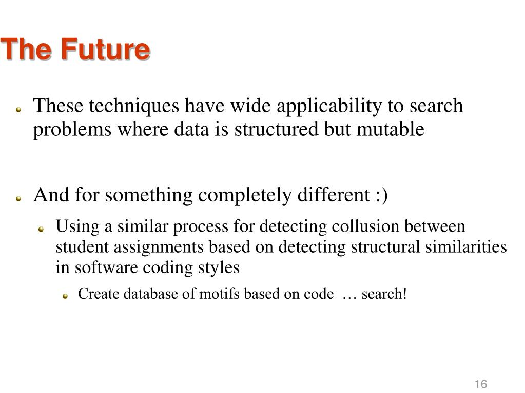 The Future • These techniques have wide applicability to search problems where data is structured but mutable • These techniques have wide applicability to search problems where data is structured but mutable • And for something completely different :) • Using a similar process for detecting collusion between student assignments based on detecting structural similarities in software coding styles • Create database of motifs based on code … search! 16