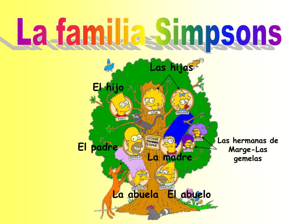 La familia Simpsons. Las hijas. El hijo. Las hermanas de Marge-Las gemelas. El padre. La madre. La abuela. El abuelo. Maggie – La hija menor. Yo tengo dos hermanos mayores - un herman o y una herman a. Bart – El hijo. Yo tengo dos herman as menores.
