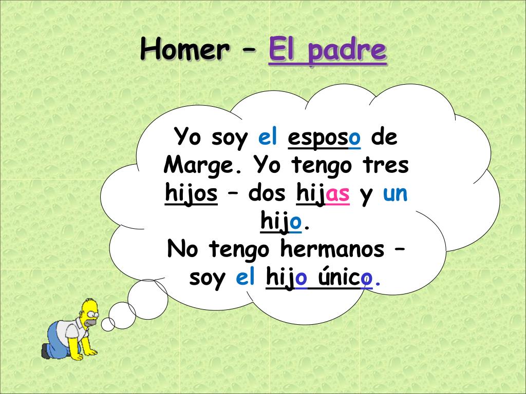 Homer – El padre Yo soy elesposo de Marge. Yo tengo tres hijos – dos hijas y unhijo. No tengo hermanos – soy el hijo único.