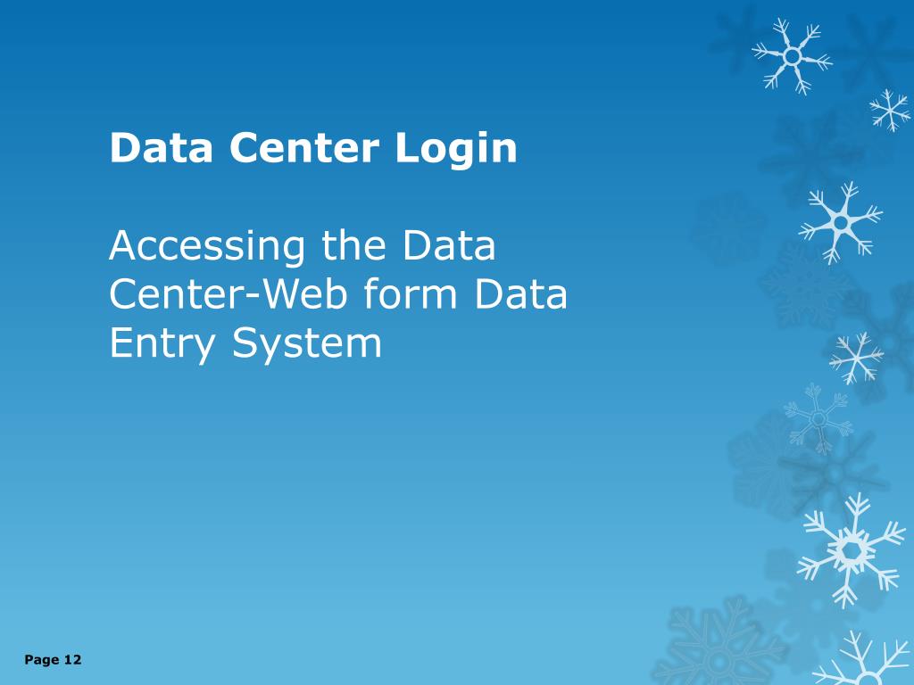 Data Center Login Accessing the Data Center-Web form Data Entry System Page 12