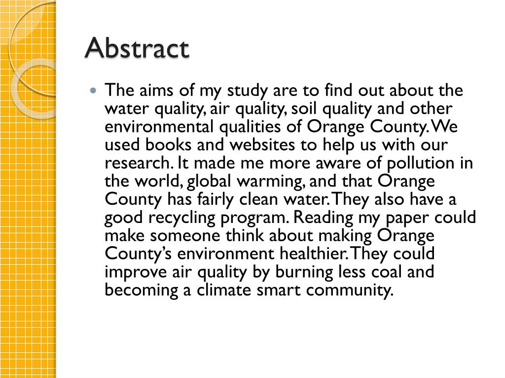 Abstract • The aims of my study are to find out about the water quality, air quality, soil quality and other environmental qualities of Orange County. We used books and websites to help us with our research. It made me more aware of pollution in the world, global warming, and that Orange County has fairly clean water. They also have a good recycling program. Reading my paper could make someone think about making Orange County’s environment healthier. They could improve air quality by burning less coal and becoming a climate smart community.