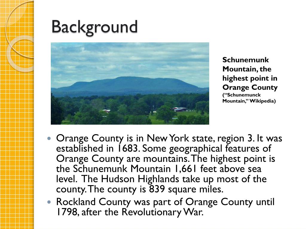 Background • Orange County is in New York state, region 3. It was established in 1683. Some geographical features of Orange County are mountains. The highest point is the Schunemunk Mountain 1,661 feet above sea level. The Hudson Highlands take up most of the county. The county is 839 square miles. • Rockland County was part of Orange County until 1798, after the Revolutionary War. SchunemunkMountain, the highest point in Orange County (“Schunemunck Mountain,” Wikipedia)