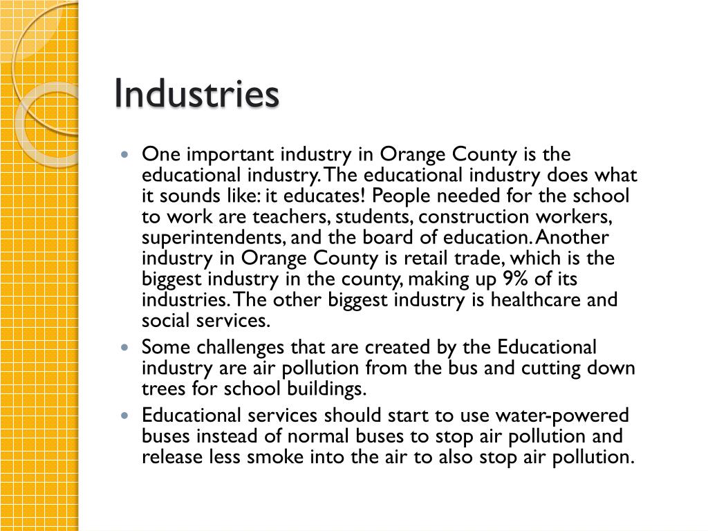 Industries • One important industry in Orange County is the educational industry. The educational industry does what it sounds like: it educates! People needed for the school to work are teachers, students, construction workers, superintendents, and the board of education. Another industry in Orange County is retail trade, which is the biggest industry in the county, making up 9% of its industries. The other biggest industry is healthcare and social services. • Some challenges that are created by the Educational industry are air pollution from the bus and cutting down trees for school buildings. • Educational services should start to use water-powered buses instead of normal buses to stop air pollution and release less smoke into the air to also stop air pollution.