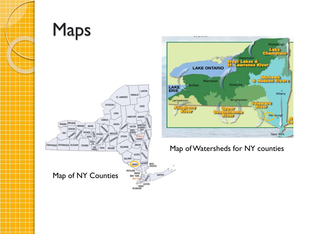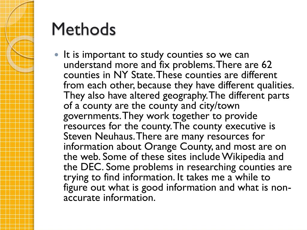 Methods • It is important to study counties so we can understand more and fix problems. There are 62 counties in NY State. These counties are different from each other, because they have different qualities. They also have altered geography. The different parts of a county are the county and city/town governments. They work together to provide resources for the county. The county executive is Steven Neuhaus. There are many resources for information about Orange County, and most are on the web. Some of these sites include Wikipedia and the DEC. Some problems in researching counties are trying to find information. It takes me a while to figure out what is good information and what is non-accurate information.