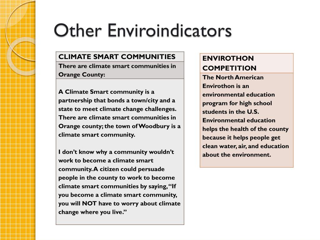 Conclusions • We should study counties because we can learn about counties, and maybe become a person who can improve a county or save a county. • The environmental health of Orange County is not great, but it’s not bad. The air quality is bad but improving. Programs in Orange County that are helping the environmental health are Climate Smart Communities. One of the most important challenges is climate change. Priority action to stop climate change is to take public transportation, use cars that go farther with less gas, and always plant trees.