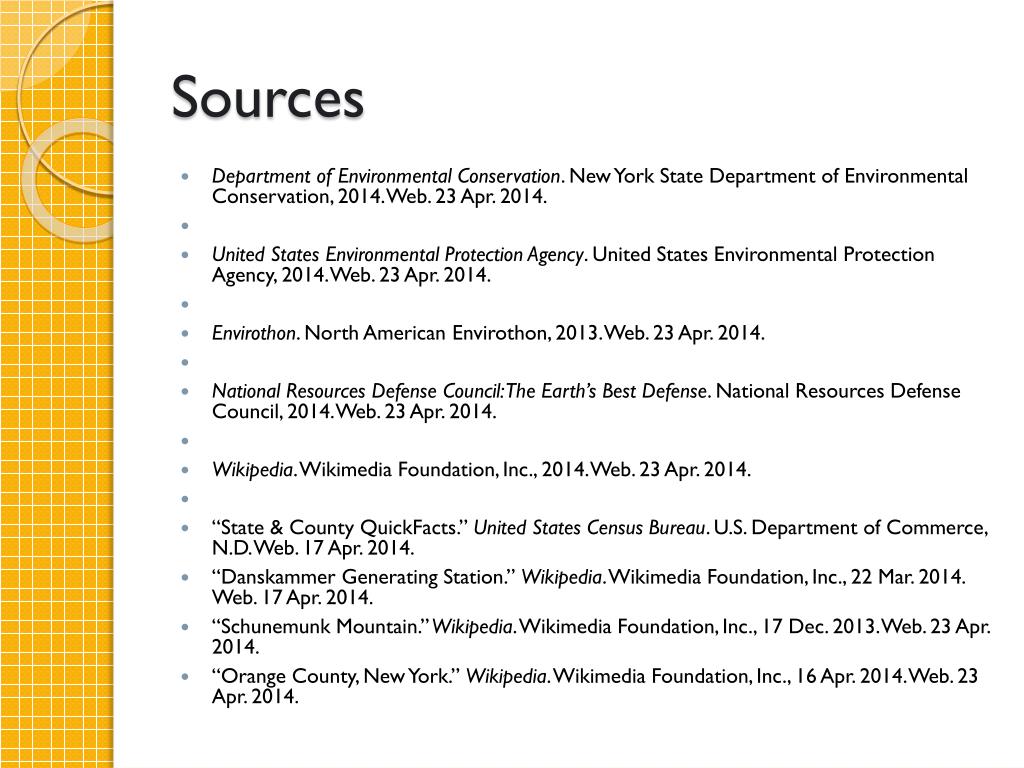Sources • Department of Environmental Conservation. New York State Department of Environmental Conservation, 2014. Web. 23 Apr. 2014. • United States Environmental Protection Agency. United States Environmental Protection Agency, 2014. Web. 23 Apr. 2014. • Envirothon. North American Envirothon, 2013. Web. 23 Apr. 2014. • National Resources Defense Council: The Earth’s Best Defense. National Resources Defense Council, 2014. Web. 23 Apr. 2014. • Wikipedia. Wikimedia Foundation, Inc., 2014. Web. 23 Apr. 2014. • “State & County QuickFacts.” United States Census Bureau. U.S. Department of Commerce, N.D. Web. 17 Apr. 2014. • “Danskammer Generating Station.” Wikipedia. Wikimedia Foundation, Inc., 22 Mar. 2014. Web. 17 Apr. 2014. • “Schunemunk Mountain.” Wikipedia. Wikimedia Foundation, Inc., 17 Dec. 2013. Web. 23 Apr. 2014. • “Orange County, New York.” Wikipedia. Wikimedia Foundation, Inc., 16 Apr. 2014. Web. 23 Apr. 2014.