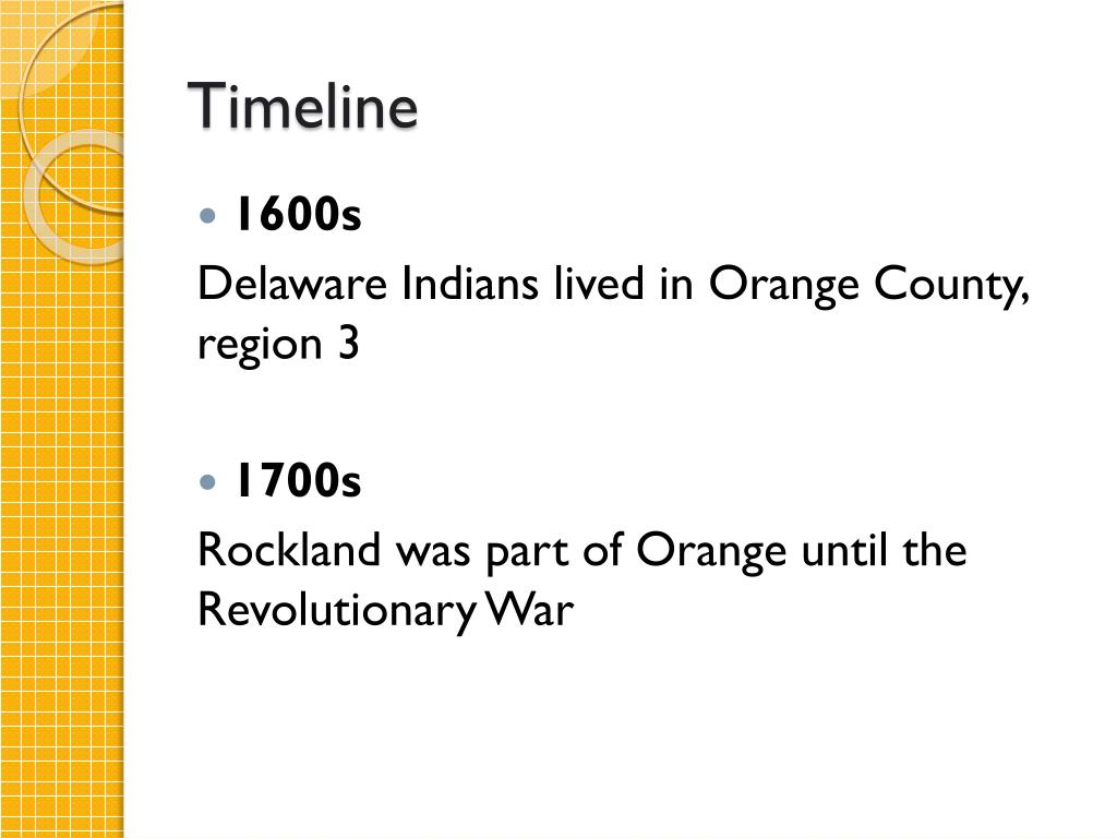 Timeline • 1600s Delaware Indians lived in Orange County, region 3 • 1700s Rockland was part of Orange until the Revolutionary War