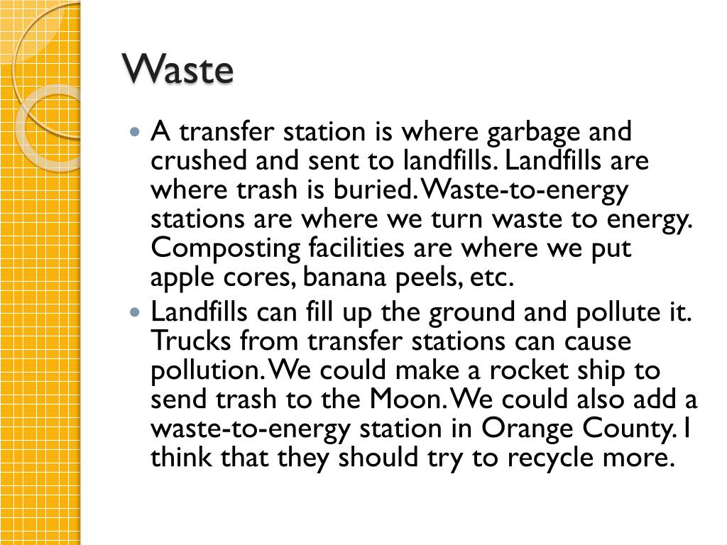 Waste • A transfer station is where garbage and crushed and sent to landfills. Landfills are where trash is buried. Waste-to-energy stations are where we turn waste to energy. Composting facilities are where we put apple cores, banana peels, etc. • Landfills can fill up the ground and pollute it. Trucks from transfer stations can cause pollution. We could make a rocket ship to send trash to the Moon. We could also add a waste-to-energy station in Orange County. I think that they should try to recycle more.