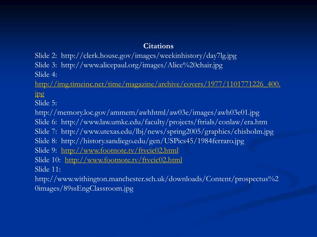 Citations Slide 2: http://clerk.house.gov/images/weekinhistory/day7lg.jpg Slide 3: http://www.alicepaul.org/images/Alice%20chair.jpg Slide 4: http://img.timeinc.net/time/magazine/archive/covers/1977/1101771226_400.jpg Slide 5: http://memory.loc.gov/ammem/awhhtml/aw03e/images/awh03e01.jpg Slide 6: http://www.law.umkc.edu/faculty/projects/ftrials/conlaw/era.htm Slide 7: http://www.utexas.edu/lbj/news/spring2005/graphics/chisholm.jpg Slide 8: http://history.sandiego.edu/gen/USPics45/1984ferraro.jpg Slide 9: http://www.footnote.tv/ftvcic02.html Slide 10: http://www.footnote.tv/ftvcic02.html Slide 11: http://www.withington.manchester.sch.uk/downloads/Content/prospectus%20images/89ssEngClassroom.jpg