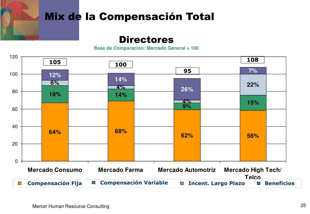 Mix de la Compensación Total Directores Base de Comparación: Mercado General = 100 108 105 100 95 Compensación Variable Compensación Fija Incent. Largo Plazo Beneficios