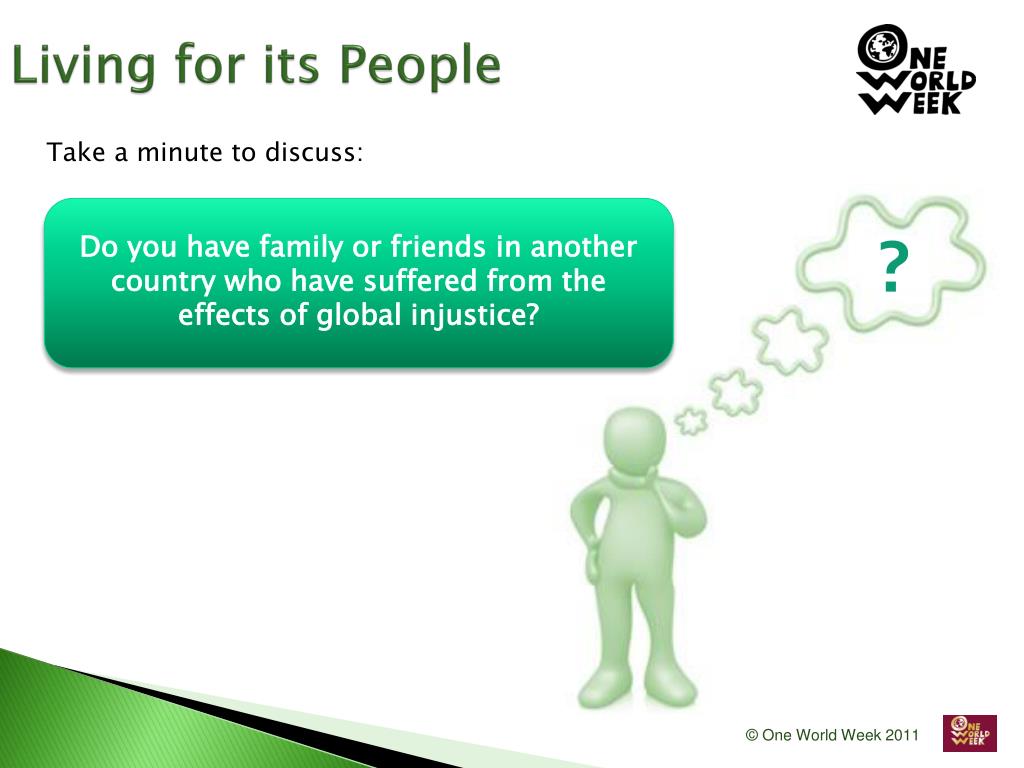 Living for its People Take a minute to discuss: Do you have family or friends in another country who have suffered from the effects of global injustice? ?