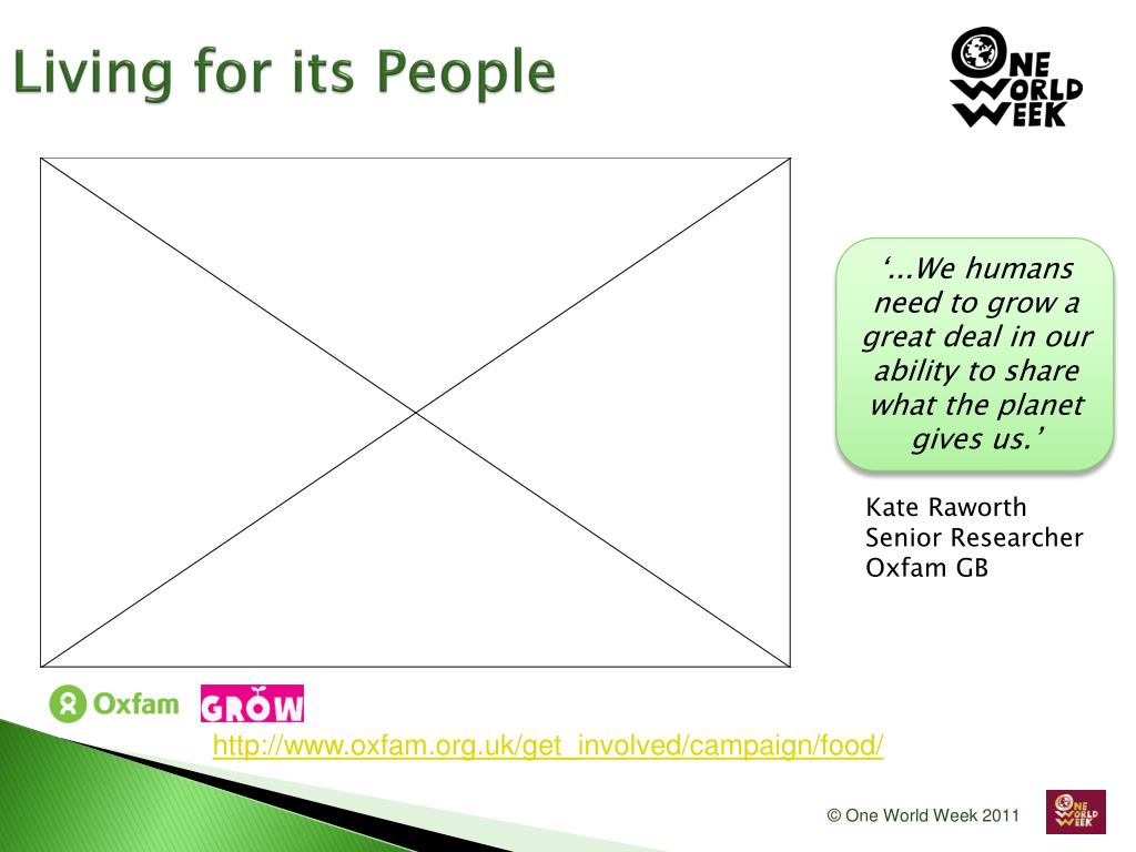 Living for its People ‘...We humans need to grow a great deal in our ability to share what the planet gives us.’ Kate Raworth Senior Researcher Oxfam GB http://www.oxfam.org.uk/get_involved/campaign/food/