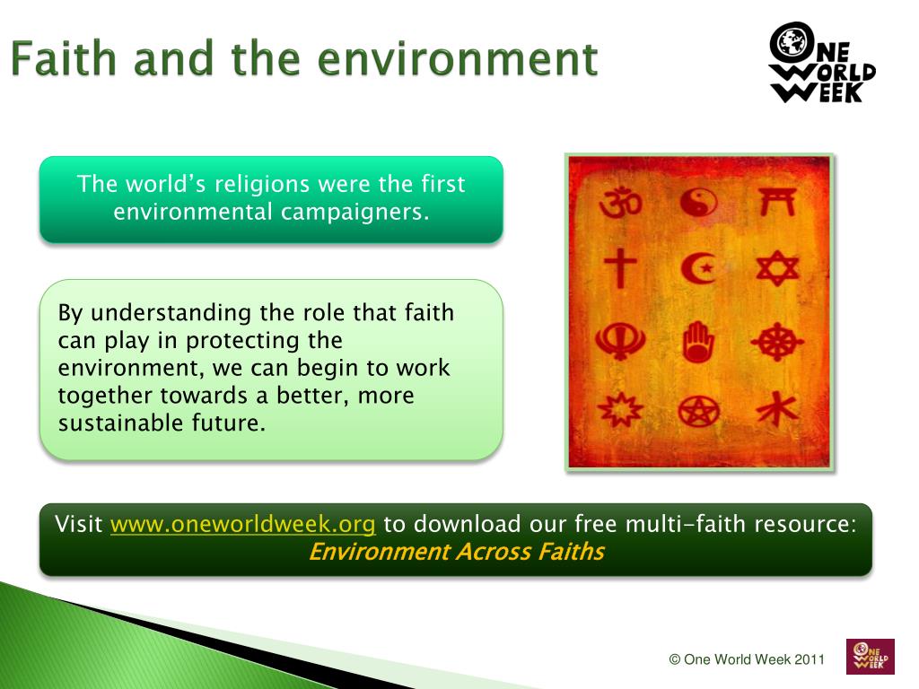 Learn about different faith perspectives You could learn about different faith perspectives on what it means to Live for One World, at your OWW event. Visit www.oneworldweek.org to download our free multi-faith resource: Environment Across Faiths