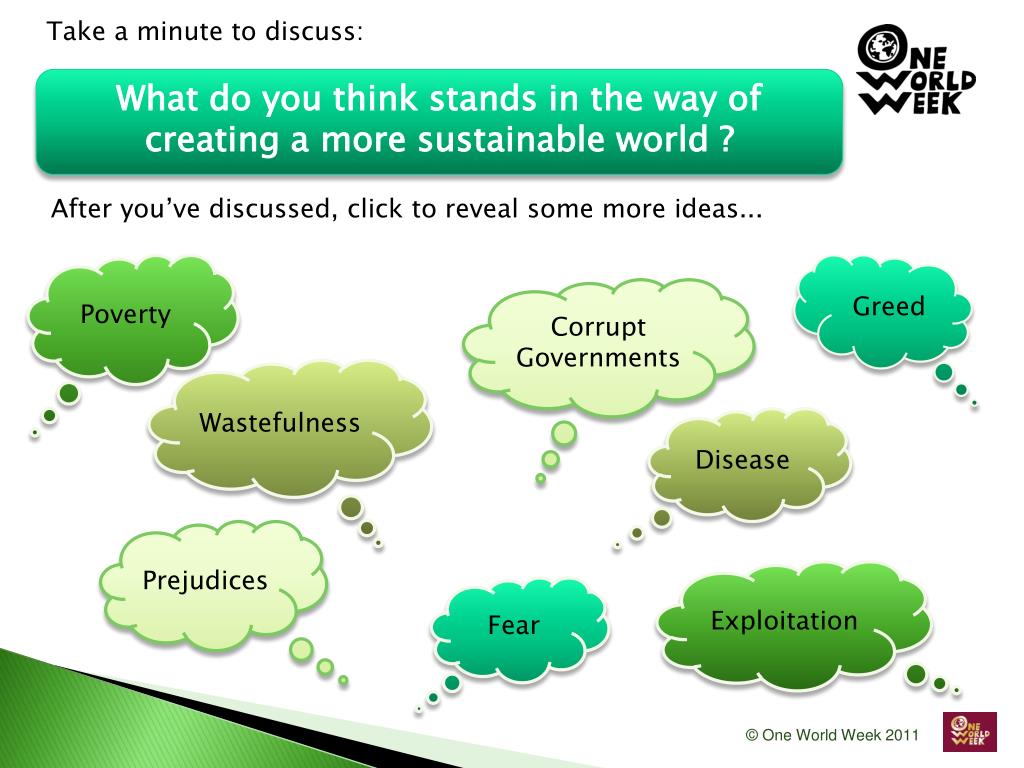 Take a minute to discuss: What do you think stands in the way of creating a more sustainable world ? After you’ve discussed, click to reveal some more ideas... Poverty Greed Corrupt Governments Wastefulness Disease Prejudices Exploitation Fear