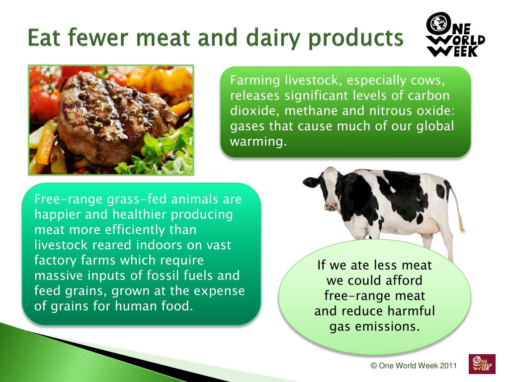 Eat fewer meat and dairy products Farming livestock, especially cows, releases significant levels of carbon dioxide, methane and nitrous oxide: gases that cause much of our global warming. Free-range grass-fed animals are happier and healthier producing meat more efficiently than livestock reared indoors on vast factory farms which require massive inputs of fossil fuels and feed grains, grown at the expense of grains for human food. If we ate less meat we could afford free-range meat and reduce harmful gas emissions.