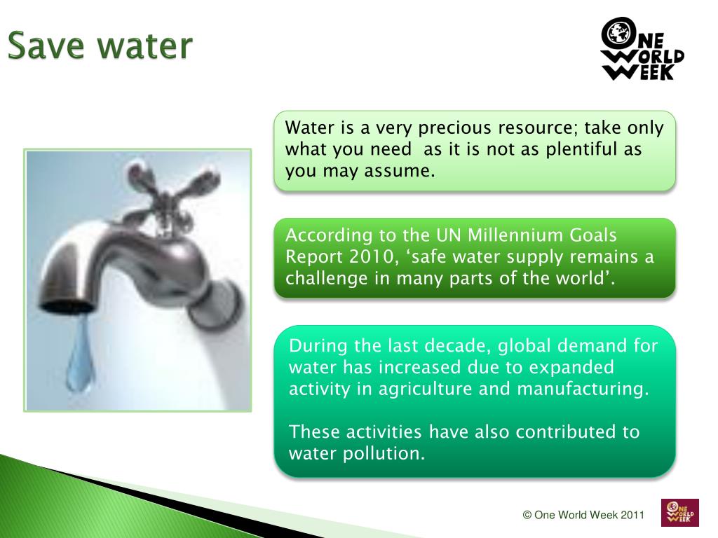 Save water • Water is a very precious resource; take only what you need as it is not as plentiful as you may assume. According to the UN Millennium Goals Report 2010, ‘safe water supply remains a challenge in many parts of the world’. • During the last decade, global demand for water has increased due to expanded activity in agriculture and manufacturing. • These activities have also contributed to water pollution.